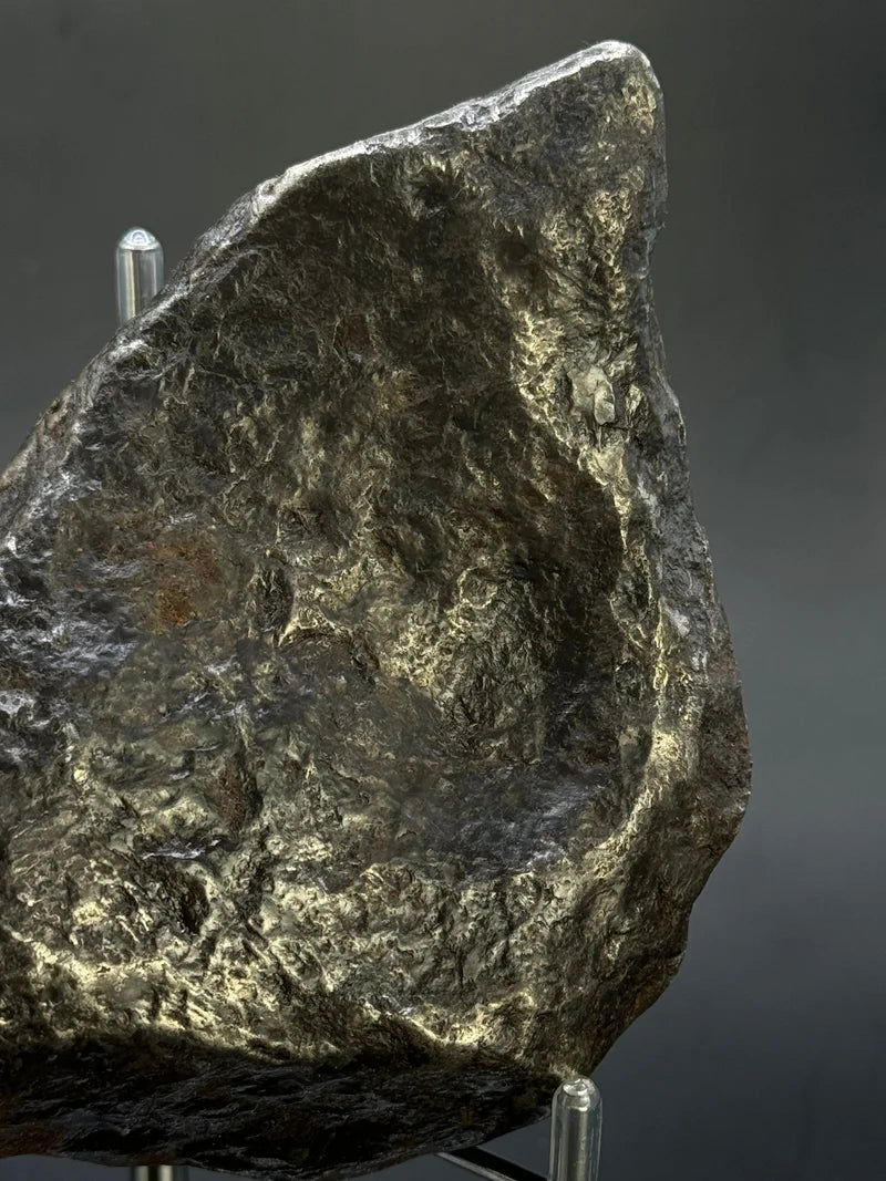 The specimen retains its original features, including natural fusion crust and regmaglypts. It has not been cut or polished, offering an untouched fragment of cosmic history.