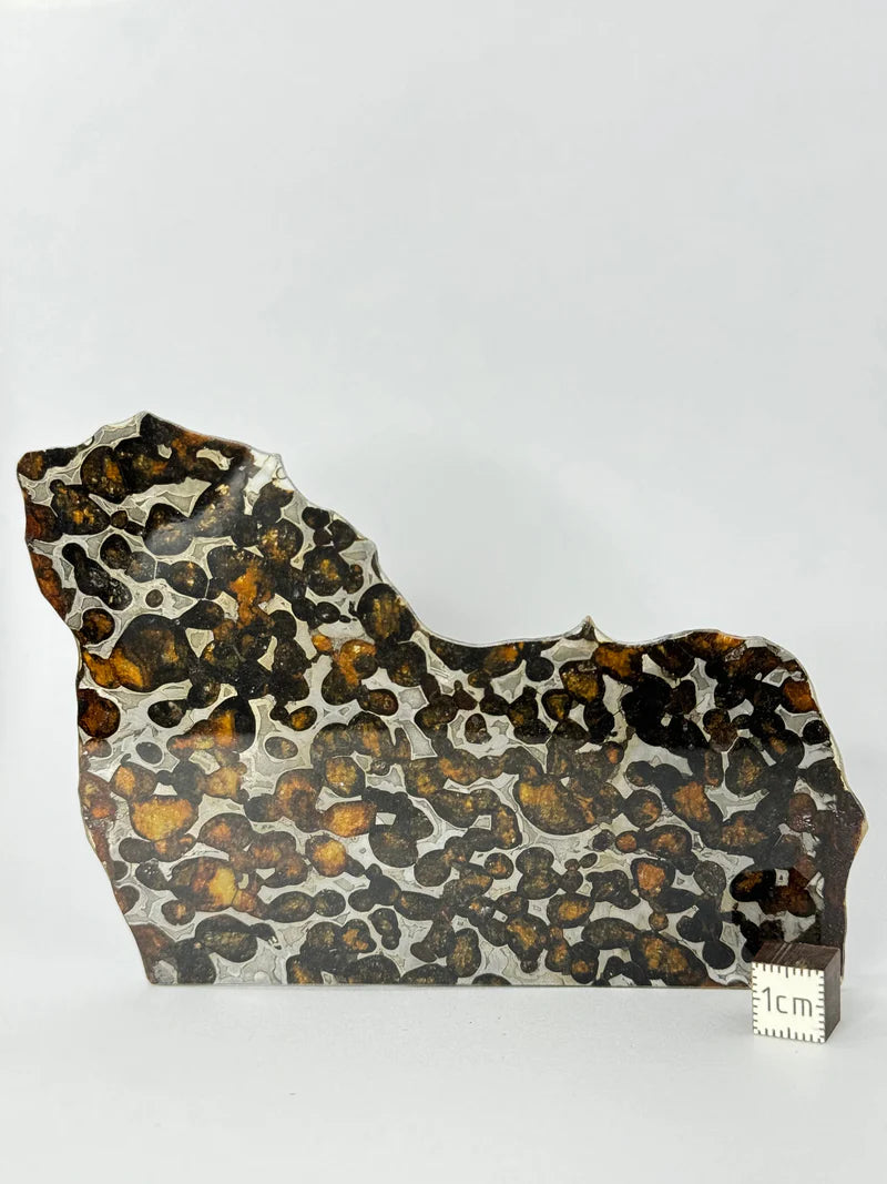 Features translucent yellowish olivine crystals embedded in an iron-nickel matrix. One side is etched, the other is polished for contrast and brilliance.